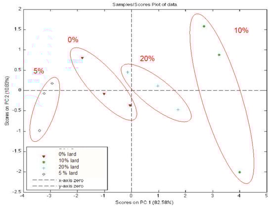 A rapid, accurate, convenient, and eco-friendly analysis for the detection of porcine-based ingredients in food is the Electronic Nose (EN), employed to exclude possible contamination or fraud and also to investigate the oxidative status of meat products [85,86,101,102]. The ability to measure and identify the aroma and characteristics of persistent flavors of a product allows to obtain a variety of information, directly related to the acceptability and to nutritional and quality characteristics in terms of product health and safety. This consideration has led to a growing need and interest in non-destructive monitoring systems with high versatility, sensitivity, accuracy, cost-effectiveness, ease of use and above all rapidity of analytical response, such as electronic nose. This artificial olfactory systems can be used not only in the laboratory but also directly in the production plants for continuous monitoring of odors, from the raw material to the final product, analyzing the volatile compounds released from the matrix related to different aspects (sensory acceptability, deterioration, development of off-flavors, etc.). In our laboratories an electronic nose equipped with non-specific sensors arrays (porphyirins based) has been used to discriminate the lard presence in ḥalāl goat meat batter. First, four experimental batches of salami were manufactured with halal goat meat (70%) and fat (30%); each of the four batches had different levels of pork fat (batch 1, Control, with lard 0% w/w of total fat; other batches, with lard 5%, 10% and 20% w/w of total fat, respectively); then EN analyses were carried out after an equilibration step (for 30 min, at temperature of 41 °C). Principal Component analyses (PCA) scores (Figure 2) evidenced that porphyirins-based EN was able to discriminate the presence of lard even at the lowest experimental concentration (5%, w/w) [129].