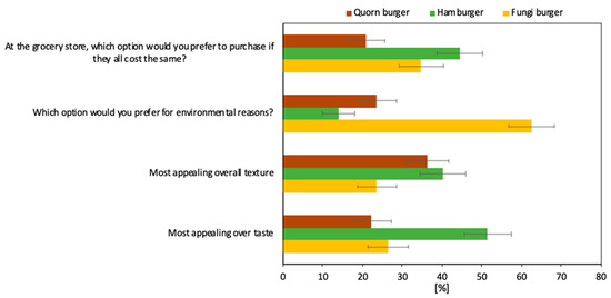 In the first section, the participants were asked to taste the fungi burger patty and compare it with two already commercially established products, namely, hamburger patties (beef- and pork-based) and Quorn burger patties (mainly composed of fungal biomass from Fusarium venenatum). The main reason for the comparison with these two commercially accepted products was to see how the fungi burger patties made from bread residuals stand against established products through the evaluation of preference profiles. On the questionnaire, the participants were asked to mark the patty option they preferred in terms of most appealing overall taste, most appealing overall texture, which option they preferred for environmental reasons, and which option they would prefer to buy at the grocery store if they were all to cost the same.