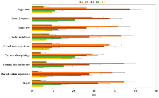 Distribution of the participants’ (n = 72) preferences on the characteristics of the fungi burger. The five-point hedonic rating scale of the characteristics is represented in the bars that ascend from excellent (5) to very poor (1). Error bars represent one standard uncertainty.