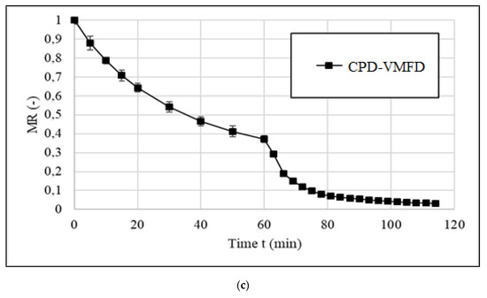 Figure 1 shows the drying kinetics of hemp flowers treated by convective drying (CD) (a), vacuum–microwave drying (VMD) (b), and combined drying (CPD-VMFD) (c), whereas Table 1 presents model constants with drying times and maximum temperature during drying using different methods.