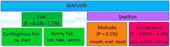 Seafood species classification and their reported allergy prevalence. The classification was performed according to the NCBI taxonomy as described [5]. Examples of each of the species are displayed in the corresponding boxes. The range of the prevalence (P) of each offending food has been taken from References [3,5].
