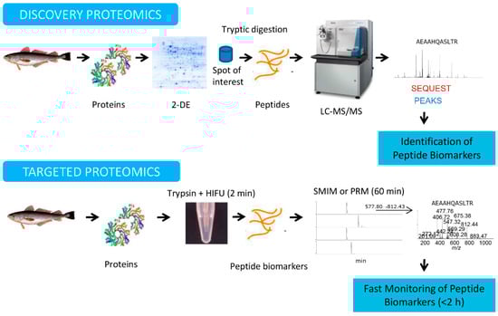 Main proteomics workflows used for the detection and quantification of seafood allergens. Basic workflows used in discovery proteomics and targeted proteomics. In the discovery proteomics approach, a mixture of proteins is separated using two-dimensional gel electrophoresis (2-DE), the spots of interest are in-gel digested with trypsin, the peptides obtained are analyzed using liquid chromatography coupled to tandem mass spectrometry (LC-MS/MS), and the spectra are identified using different database search engines, such as SEQUEST and PEAKS. Specific peptide biomarkers can be selected. In the fast targeted proteomics approach, the mixture of proteins is in-solution digested with trypsin, accelerated using high-intensity focused ultrasound (HIFU), and then the peptide biomarkers selected in the discovery approach can be monitored using selected MS/MS ion monitoring or parallel reaction monitoring (PRM) during mass spectrometry. The monitoring of peptide biomarkers can be performed in less than 2 h.