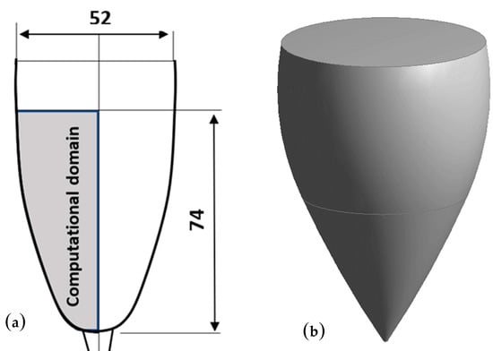 Computational domain, in gray, as determined for the 2D computational fluid dynamics (CFD) approach (a) and a 3D sketch of the glass, as determined for the 3D CFD approach (b). In frame (a), dimensions are indicated in mm for the glass filled with 100 mL of champagne.