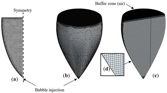 The discretization of the calculation domains (2D and 3D) was achieved using ANSYS® Workbench Meshing software. Because 2D modeling is carried out with axisymmetric calculations, only half of the fluid domain is meshed, as seen in Figure 3. The 2D mesh is composed of about 7700 quadrilateral and hexahedral elements, with a structured grid in the central part of the computational domain and an unstructured grid in the vicinity of the glass wall. To ensure that the results of the CFD calculation were consistent with the experimental results, a grid dependency test was performed. The convergence test consisted of improving the results by using successively smaller cell sizes. More details about the grid dependency test can be found in a previous study [19].