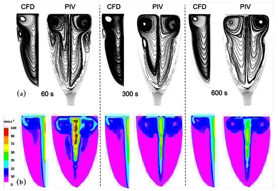Comparison between the CFD and particle image velocimetry (PIV) streamline patterns as time proceeds (respectively 60 s, 300 s and 600 s after champagne was poured into the glass) (a); comparison between the CFD and PIV velocity fields as time proceeds (respectively 60 s, 300 s and 600 s after champagne was poured into the glass) (b).