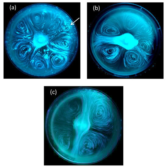 In recent years, laser tomography and PIV techniques have been used to highlight the self-organized ascending bubble-driven flow patterns in various laser-etched champagne glasses. Previous experiments revealed that the overall flow patterns found in glasses mainly depends on glass shape combined with the intensity of the central bubbly flow (and therefore on the level of dissolved CO2 found in champagne) [13,14,15,16,17,18]. Moreover, and most interestingly, in a standard laser-etched coupe filled with champagne, self-organized and counter-rotating two-dimensional convective cells were also unveiled at the air/champagne interface [45]. Various regimes were evidenced, from a highly unstable eight-cell regime, to a very stable four-cell regime [45], as shown in Figure 6. There are indeed eight cells counter-rotating close to each other in Figure 6a (with seven big cells and a much smaller one marked with a white arrow). From the topological point of view, the four-cell regime displayed in Figure 6c looks strikingly like the so-called steady streaming flow, resulting from the action of an oscillatory cylinder in the main body of a fluid or in thin boundary layers [46,47,48].