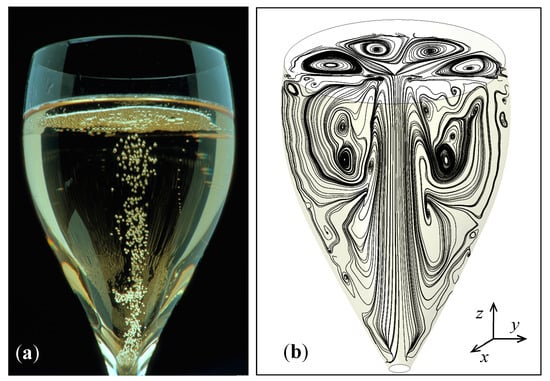 - Beaumont, F.; Liger-Belair, G.; Polidori, G. Instabilities and topological behavior of the flow inside champagne glasses. J. Flow Visual. Image Proces. 2015, 22, 97–115. [Google Scholar] [CrossRef]