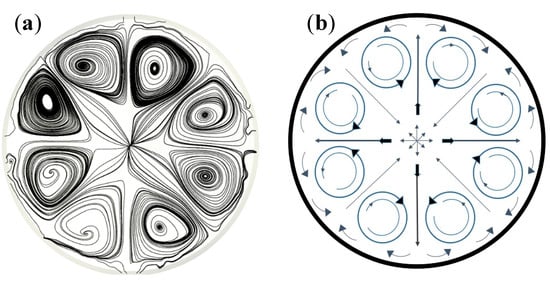 A close-up view of the self-organized 2D eight-cell regime found at the air/champagne interface, as determined through the 3D CFD model, is displayed in Figure 8a. A schematic layout is displayed in Figure 8b, which shows eight identical counter-rotating cells confined within a network of eight branches of fluids alternatively diverging and converging with regard to the center of the glass. In the center of the glass, the emerging bubbly flow pushes the fluid radially across the air/champagne interface, where the 2D flows split and self-organize along several preferential directions. The 2D eight-cell regime found at the air/champagne interface is therefore characterized by four branches of fluid diverging from the center of the glass, and four others converging toward the center of the glass, as detailed in Figure 8b.