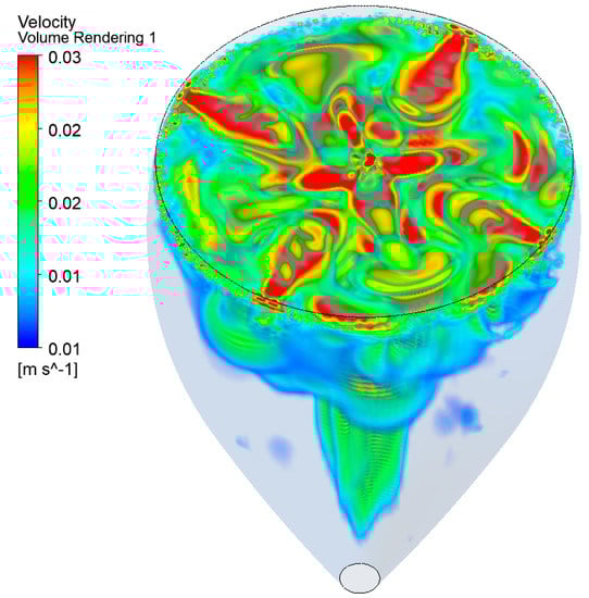 The volume velocity field resulting from the 3D simulations, corresponding to the streamlines shown in Figure 7b and Figure 8a, is displayed in Figure 9. At the air/champagne interface, the interplay between the four branches of fluid diverging from the center of the glass and the four others converging is clearly visible. Actually, the highest velocity zones can clearly be identified along the eight branches of fluid crossing in the center of the glass.