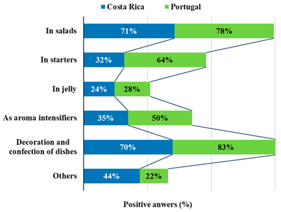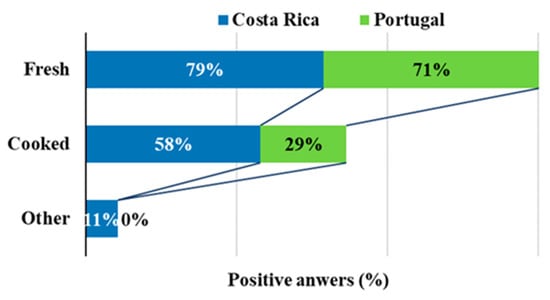 It was observed that 29% of the participants used EF for gastronomic preparations, this percentage being equal in both countries. Additionally, it was observed that the fresh state was the preferred form of consumption, by 75% of participants, while 43% used them cooked. Some differences were found between countries for the utilization of EF in the cooked form, being more expressive among consumers in Costa Rica (58%) than in Portugal (29%) (Figure 5).