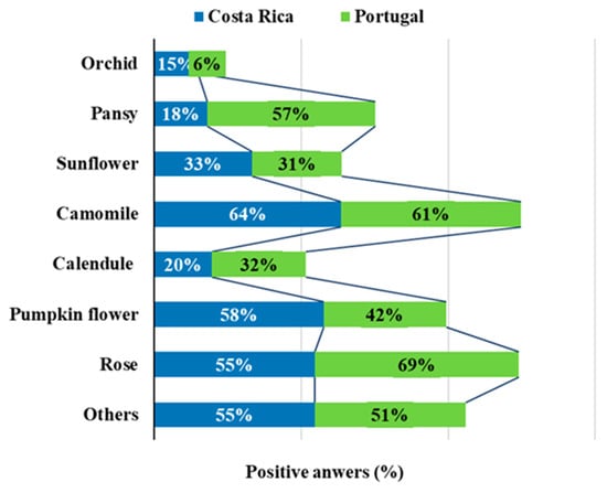 One other question of the survey investigated which flowers the participants had already consumed. There are many flowers that are safe for human consumption and their usage can be varied according to availability and the chef’s discretion. Some of the most frequently reported EF include violet, pansy, marigold, rose, daisy, chicory, gardenia, hibiscus or jasmine, to name a few [6,32], and those most consumed by the participants in this study are included in this list. In this study, the most consumed flowers were chamomile and rose (by 62% of the participants in both cases). Then came the pumpkin flower (49%), pansy (38%), sunflower (32%), calendula (26%), orchid (10%), and others not specified were consumed by 53% of the participants. The results shown in Figure 2, which separates the consumption by country, indicate that most of the flowers which are popular in Costa Rica are also popular in Portugal and vice-versa: chamomile (64% and 61%, respectively, for Costa Rica and Portugal) and rose (55% and 69%, respectively) as the most popular, and orchid (15% and 6%, respectively) as the least. The usage of EF is very much dependent on tradition on one side, but also on innovation and new gastronomic trends on the other. While in Europe and Asia there is an old tradition linked with the usage of flowers for human consumption which is well documented, in some other parts of the world this habit is not so present among the population. Additionally, European chefs are among those who use creativity to explore the application of EF into their recipes [5,25], and this helps to explain some differences found when comparing the usage of EF in Portugal and in Costa Rica.