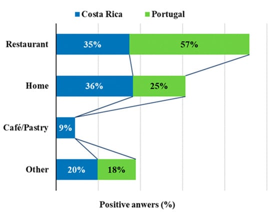 The places where the participants ate EF for the first time were in restaurants (for 46%), followed by the participants’ own homes (30%) and only a small percentage ate them for the first time in cafés or pastry shops (4%). According to Figure 4, the first consumption for the Portuguese occurred mostly at restaurants (57%) and with a lower expression at home (25%), while in Costa Rica both places were even (35% and 36%, respectively, for homes and restaurants). As chefs know already that some aspects linked with culinary pleasure captured through our senses are closely connected to emotions, they explore this by using ingredients and raw materials which are able to awaken these sensations. Hence, flowers, due to their varied colors, intense aromas and exquisite taste, are among those ingredients, and restaurants are, therefore, places where EF can be found in gastronomic preparations [35,36].