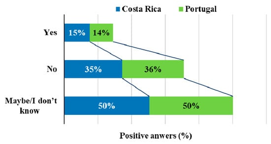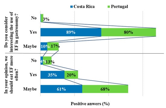 Finally, two questions were dedicated to gathering the participants’ opinions about the usage of EF in gastronomy. The results obtained showed that most participants (85%) consider the use of EF for gastronomic purposes interesting, particularly those from Costa Rica (89%) with a higher expression than Portugal (80%) (Figure 8). Regarding the second question, only 27% believe that we should eat EF more often, being a higher percentage for participants from Costa Rica (35%) than Portugal (20%).