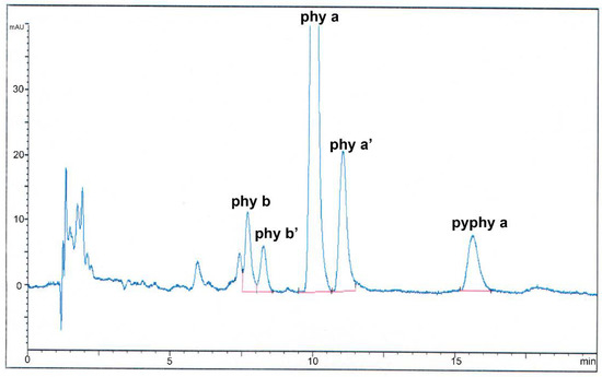 The selected conditions lead to the separation of individual pigments. The HPLC chromatograms consist of a series of peaks, three of them well resolved, whose retention times appear within the range from 15 to 25 min (Figure 1). They correspond to phy b and b’, phy a, phy a’, and pyphy a. After, pyphy a’ might also appear. Those peaks were identified according to the published bibliography [28,33].