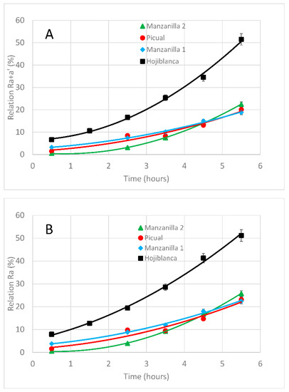 In all cases, there was a quick rise in phy a+a’ during the first hours of treatment, which slowed down later (Figure 2A). In the case of hojiblanca cultivar, the Ra+a’ relation reaches 17% after around 2.5 h, whereas in the cases of picual, manzanilla 1 and manzanilla 2, at least 4.5 h are needed to exceed the 17% threshold. Such a 17% limit is the one proposed by Australian and Californian regulatory bodies and corresponds to the minimum pyphy a content accepted for fresh EVOO [40,41]. Differences among cultivars (Table 3) may be due to the low initial pyphy a content, 0.70 mg/kg, in comparison with the phy a+a’ presence, 10.90 mg/kg, observed in hojiblanca, which in turn gives an already higher initial Ra+a’ in comparison to the others.