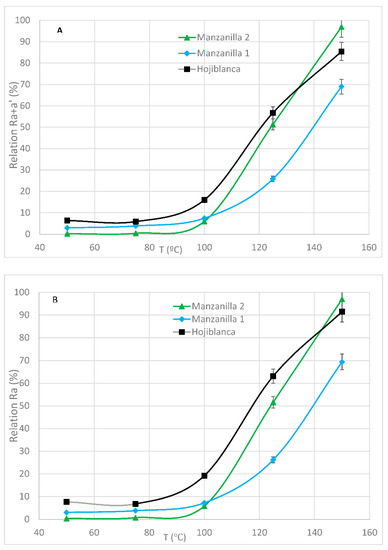(A): Ra+a’ relation vs. soft deodorization temperature and (B): Ra relation vs. soft deodorization temperature, in VOO samples from manzanilla and hojiblanca cultivars. The soft deodorization process lasted two hours. N2 was used as a stripping gas. Each value corresponds to the average of two individual pieces of data.