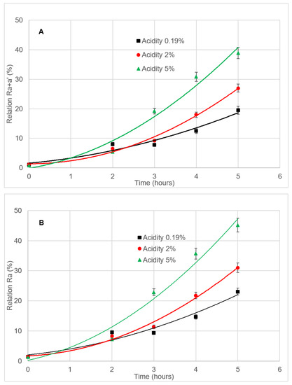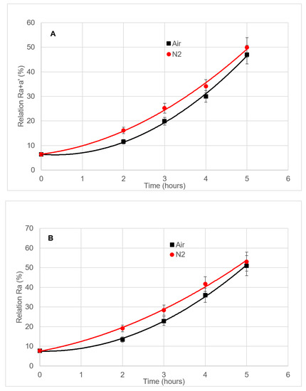 The results are shown in Figure 5. When N2 is utilized as a stripping gas, the Ra+a’ relation is around 4.6–5% higher than when air is chosen (Figure 5A), meaning that the 17% limit is exceeded after 2.0 h in the case of N2, and after 2.7 h if air is applied. After three hours, there is not a statistically significant difference on the Ra+a’ relation between both stripping gases. The same tendency is observed for the Ra relation, although the time to surpass the limit is 1.5 and 2.4 h, respectively (Figure 5B).