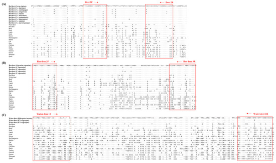 The sequence alignment of red deer (A), roe deer (B), and water deer (C) specific primers in the mitochondrial cytochrome b, 12 S rRNA, and D-loop regions against various animal species.