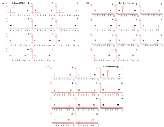 Electropherograms of specificity results of the single PCRs using newly designed primer sets for red deer (A), roe deer (B), and water deer (C). FU: fluorescence, M: alignment marker, lane 1: red deer, 2: roe deer, 3: water deer, 4: beef, 5: pork, 6: lamb, 7: goat, 8: horse, 9: chicken, 10: duck, and N: non-template.