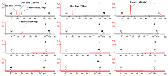 Electropherograms of specificity result of the multiplex PCR assay for red deer, roe deer, and water deer. FU: fluorescence, M: alignment marker, lane P: positive control (red deer, roe deer, and water deer), lane 1: red deer, 2: roe deer, 3: water deer, 4: beef, 5: pork, 6: lamb, 7: goat, 8: horse, 9: chicken, 10: duck, and N: non-template.