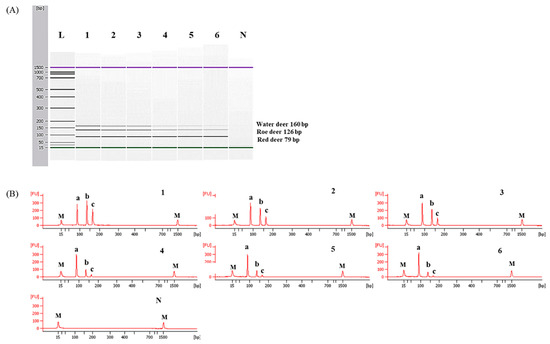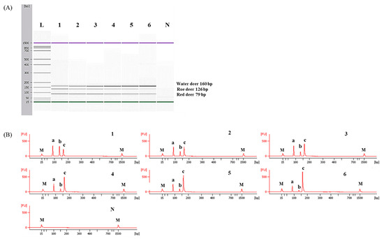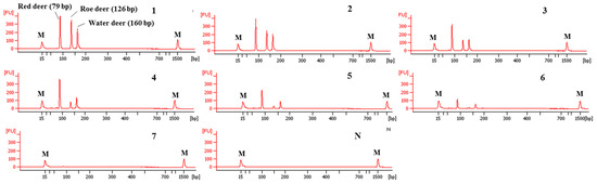Using these newly designed primers for the identification of red deer, roe deer, and water deer, a multiplex PCR was first optimized by adjusting the concentration of each primer and annealing temperature of PCR condition. The specificity of this optimized assay was then evaluated using DNAs isolated from 10 animal species. As shown in Figure 3, each primer set for red deer, roe deer, and water deer in CE-mPCR specifically amplified target species, showing a high resolution between target species. These results indicated that these red deer-, roe deer-, and water deer-specific primers were sufficient to differentiate these closely related three species by multiplex PCR without causing any cross-amplification against non-target species.