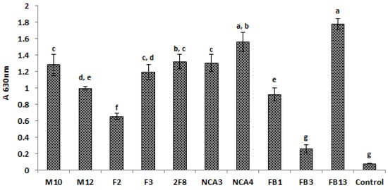 The results illustrated in Figure 1 highlight the capabilities of Lactobacillus strains to adhere and form biofilms under the tested conditions. Consequently, the absorbencies recorded for Lactobacillus strains ranged from 0.26 to 1.78 (Figure 1). Nine out 10 strains were strongly adherent according to the classification proposed by Stepanović et al. [36], whereas Lb. plantarum FB3 appeared to be moderately adherent. Remarkably, the most adherent strains were Lb. plantarum FB13 followed by Lb. plantarum NCA4. Regarding the pathogenic strains, the absorbencies recorded for E. coli ATCC 8739, L. monocytogenes 162 and S. aureus 2S6 were 0.366, 0.422 and 1.368, respectively. Therefore, S. aureus 2S6 was thereof considered as strongly adherent, while E. coli ATCC 8739 and L. monocytogenes 162 were moderately adherent.