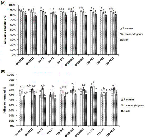 Adhesion inhibition (A) and removal (B) rates of pathogens (S. aureus 2S6, E. coli ATCC 8739 and L. monocytogenes 162) on polystyrene microplates, by Lactobacillus non-neutralized cell-free supernatants. The positive control was the non-treated pathogens suspensions, and the negative control was the pathogens suspensions treated with sterile de Man Rogosa and Sharpe (MRS) broth. The rates are the means of three independent experiments. The error bars represent the standard deviations. Columns without common letter are significantly different (p < 0.05) using Tukey’s test.