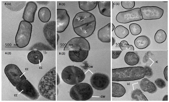 TEM was used to observe the ultra-structural modifications, if any, of pathogens cells treated with CFS from Lactobacillus strains. The data gathered showed the disruption of the cell wall structure and the condensation of ribosomes. Therefore, bacterial death resulted from the wall’s mechanical strength and osmotic lysis. The cytoplasm content of treated E. coli cells was agglutinated and appeared as globules of variable size. Nevertheless, the membrane was easily observed as being devoid of any break or clear cut (Figure 3A(2)). Notably, the treated S. aureus cells did not show any particular intracellular damage. The cell wall was altered with a “frayed” appearance, indicating a possible peptidoglycan alteration (Figure 3B(2)). Regarding L. monocytogenes, cells exhibited an altered cell wall, separation of membrane layers and leakage of intracellular contents (Figure 3C(2)).