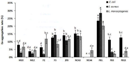 Co-aggregation ability of Lactobacillus strains with pathogens after 2 h of process. The rates are the means of three independent experiments. The error bars represent the standard deviations. Columns without a common letter are significantly different (p < 0.05) using Tukey’s test.