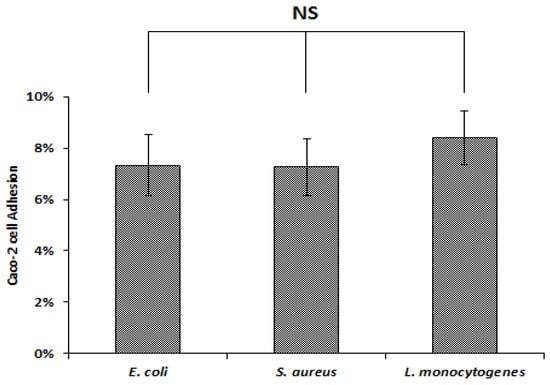 Adhesion percentage of the tested pathogens on Caco-2 cells. Each assay was conducted in triplicate. Means and standard errors are shown. NS, not significantly different (p > 0.05) using Tukey’s test.