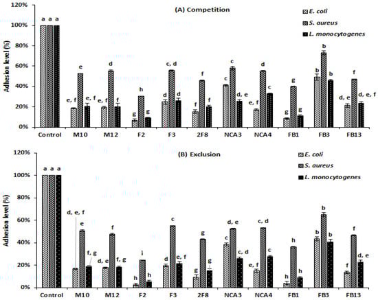 Adhesion rates of E. coli ATCC 8739, S. aureus 2S6 and L. monocytogenes 162 to Caco-2 cells in the presence of Lactobacillus strains. A: Competition (Lactobacillus strain with pathogen for 120 min). B: Exclusion (pre-incubation of Lactobacillus strain for 90 min, before adding pathogen for 120 min). The rates are the means of three independent experiments. The columns without a common letter are different significantly (p < 0.05) using Tukey’s test.
