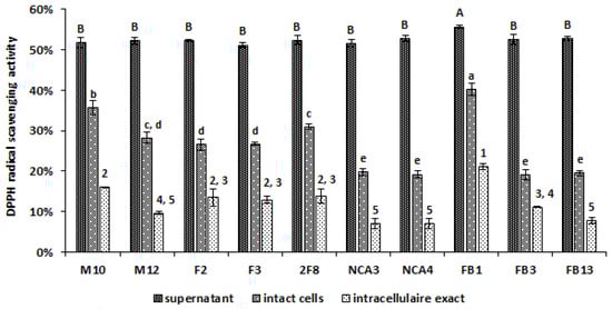 DPPH free radical scavenging activities by supernatants, intact cells and intracellular extract of Lactobacillus strains. Each rate was expressed as mean and standard errors are shown. Means within a column with different (number, lowercase and uppercase) letters are significantly different (p < 0.05) using one-way ANOVA with Tukey test for pairwise comparisons.