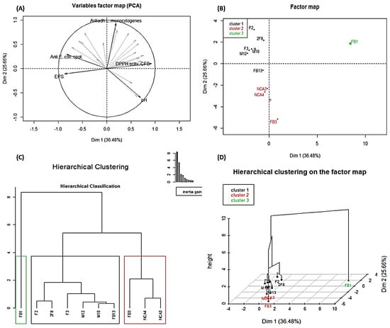 Principal component analysis (PCA) of Lactobacillus strains based on the antagonistic, antioxidant and production of both lactic acid and exopolysaccharides using FactoMineR. (A) Projection of the 24 variables into the two-dimensional space of Dim 1 and Dim 2; in bold are the variables that contributed most to the construction of the principal component analysis. (B) Projection of the ten Lactobacillus strains into the two-dimensional space, Dim 1 and Dim 2. (C) Hierarchical clustering of the Lactobacillus strains generated based on several tested proprieties. (D) Lactobacillus strains hierarchical grouping in a three-dimensional space.