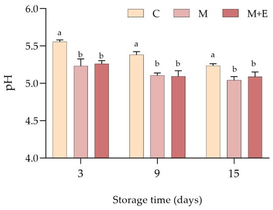 As reported in Figure 1, at each sampling time, control samples showed significantly higher pH than the marinated ones (p < 0.05) which, in their turn, exhibited similar values. A slight decrease in pH following refrigerated storage was observed for all the experimental groups, with C samples showing the greatest pH decline. In more detail, control samples exhibited an average pH decrease of 0.32 units, while M and M + E decreased of 0.19 and 0.17, respectively.