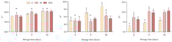 Average lightness (L*), redness (a*) and yellowness (b*) values of non-marinated (C), marinated (M) and marinated with essential oils (M + E) pork loin slices at 3, 9 and 15 days of refrigerated storage. Data represent means ± SD. a, b = average values lacking a common letter significantly differ among the same sampling time. At the same storage time, ns indicates no significant differences among the samples.