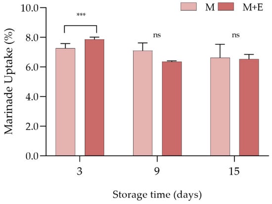 Average marinade uptake (%) values of marinated (M) and marinated with essential oils (M + E) pork loin slices at 3, 9 and 15 days of refrigerated storage. Data represent means ± SD. *** = p < 0.001. At the same storage time, ns indicates no significant differences among the samples.