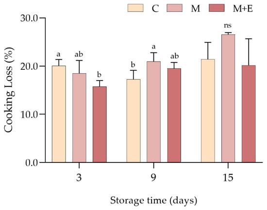 Results concerning the cooking losses at different storage times are shown in Figure 4. After 3 days of refrigerated storage, C (non-marinated samples) showed significantly higher liquid losses if compared to M + E samples (p < 0.001), while M group exhibited intermediate values. However, different results were observed at day 9 with the C group showing significantly lower values if compared to M, whereas no significant differences were found at day 15.