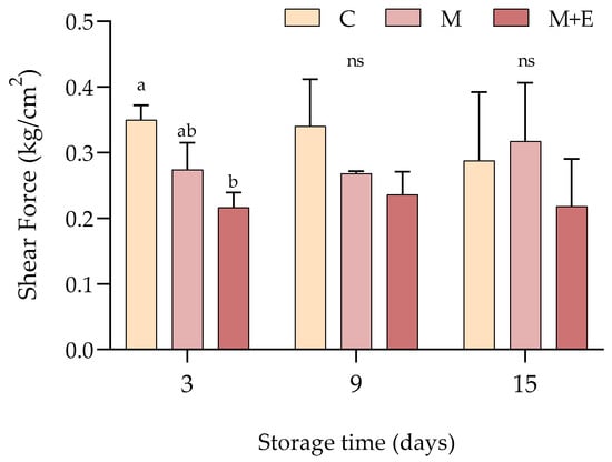 Average shear force values (kg/cm2) of non-marinated (C), marinated (M) and marinated with essential oils (M + E) pork loin slices at 3, 9 and 15 days of refrigerated storage. Data represent means ± SD. a, b = average values lacking a common letter significantly differ among the same sampling time. At the same storage time, ns indicates no significant differences among the samples.