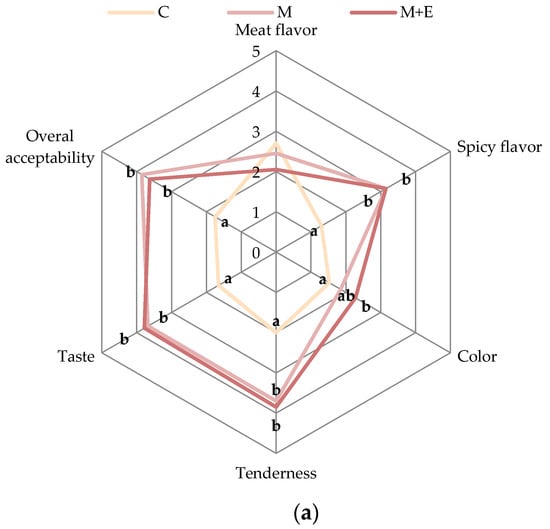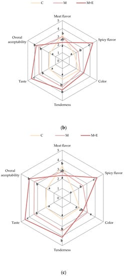 Sensory data of pork loin slices after 3 days (a), 9 days (b) and 15 days (c) of storage in relation to the sample (Control (C), Marinated (M), marinated with essential oils (M + E)). Data represent means ± SD. a, b, c = average values of each sensorial parameter lacking a common letter significantly differ among the same sensory parameter.