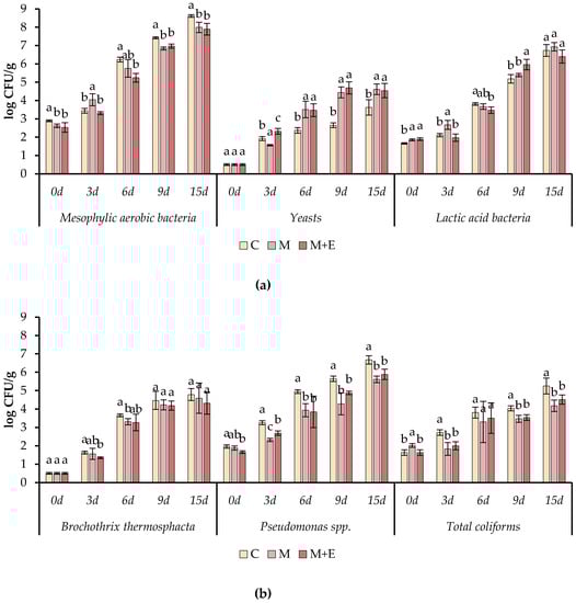 A different trend was observed for yeasts and lactic acid bacteria. In fact, starting from day 6 of storage, yeasts resulted significantly higher in samples M and M + E compared to the control. However, yeasts never exceed 5.0 log CFU/g for the whole period of storage. In case of lactic acid bacteria, no significant differences were detected at the end of the storage among the samples.