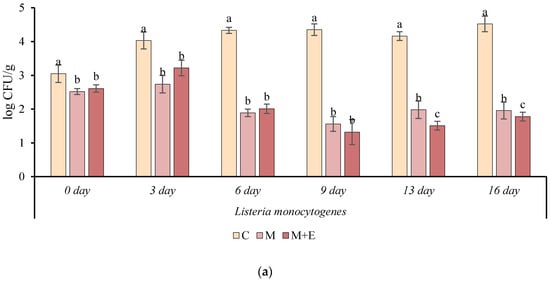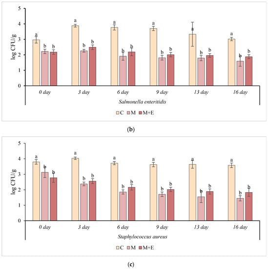 Cell load (log CFU/g ± SD), during refrigerated storage, of Listeria monocytogenes (a), Salmonella enteritidis (b), and Staphylococcus aureus (c). in different pork loin samples: Control (C), Marinated (M), marinated with essential oils (M + E). Data represent means ± SD. a, b, c = for each microorganism, at the same time of storage, average values lacking a common letter significantly differ among the same sampling time (p < 0.05).