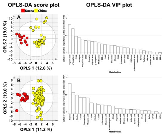 The OPLS-DA analysis was performed with UV-scaling data. The OPLS score plot of perilla seeds showed good separation on the basis of geographic origins (Korea and China) (Figure 1A). To identify the potential biomarkers for the geographic discrimination of perilla seeds, variable importance in projection (VIP) plots were used to explain the contribution of metabolites to the prediction models wherein VIP values greater than 1.00 indicate the significant influence on the model. In total, 29 metabolites had greater than 1.00 VIP values (Table S12). Glycolic acid, α-tocopherol and C20:0 were top-ranked metabolites in the VIP plots. The OPLS score plot of sesame seeds also showed good separation by region (Korea and China) (Figure 1B). In total, 26 metabolites showed a VIP cut off value of over 1.00 (Table S13). Proline, glycine and alanine were top-ranked in VIP plots.