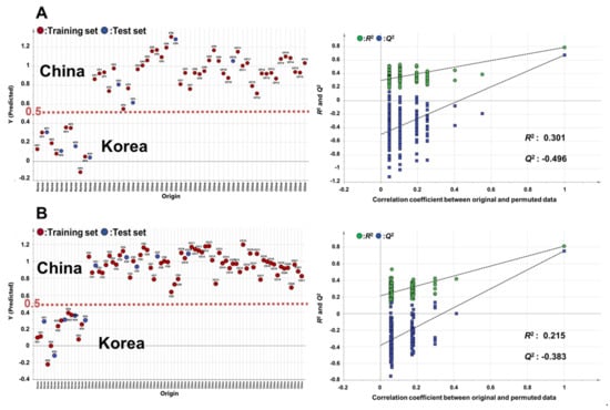 Figure 2. External validation test and permutation test by OPLS-DA for discriminating the geographic origin of (A) perilla and (B) sesame seeds from Korea and China. The number of permutations for the permutation test was 200. (A: R2X = 0.298, R2Y = 0.788, Q2 = 0.674, RMSEP = 0.229; B: R2X = 0.320, R2Y = 0.812, Q2 = 0.754, RMSEP = 0.208).