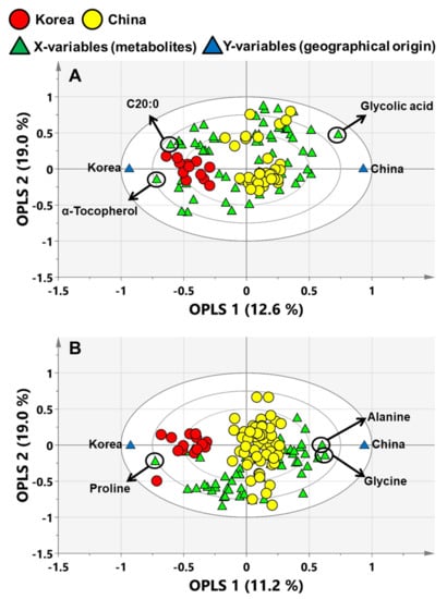 Figure 3. The OPLS-biplot for discriminating the geographic origin of (A) perilla and (B) sesame seeds using metabolite profiling data. The OPLS-biplot showed correlation of all metabolites (X-variables), sample clusters (observations) and geographic origins (Y-variables). C20:0; arachidic acid.