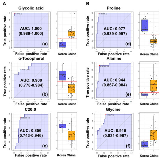 Figure 4. Receiver operating characteristic (ROC) curves for discriminating the geographic origins of (A) perilla and (B) sesame seeds using metabolite profiling data. ROC curves for (a) glycolic acid, (b) α-tocopherol and (c) C20:0 (arachidic acid) on discriminating (A) perilla seeds from Korea and China. ROC curves for (d) proline, (e) alanine and (f) glycine on discriminating (B) sesame seeds from Korea and China.