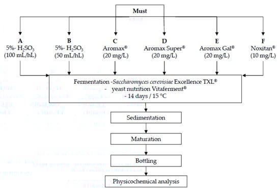 The grape variety used in this experiment was Sauvignon Blanc (Vitis vinifera L.), cultivated and processed at the Experiment Station of Faculty of Agriculture (growing hill Zagreb, Croatian Uplands). Experimental wines were produced by the processing of 450 kg of grapes. Manual grape harvesting was conducted on the 6th September 2018. The grapes were processed by using of automatic destemmer and crusher and pressing was done by a hydraulic press. Basic must quality parameters like sugar concentration, total acidity, pH, free α-amino nitrogen and total phenols were determined. The must was divided into six 50 L -stainless steel vessels (samples A, B, C, D, E, F) and different reducing agents were added to each sample (Figure 1). The reductive addition treatments were: (A) SUMPOvin (Inovet doo, Varaždin, Croatia), a 5%-sulfurous acid used in the standard dosage 100 mL/hL; (B) SUMPOvin, 5%-sulfurous acid, 50 mL/hL, (C) Aromax® (AEB, Brescia, Italy) combines 50% potassium metabisulfite (54 mg/L of SO2) and 50% L-ascorbic acid (60 mg/L); (D) Aromax Super® (AEB, Brescia, Italy) 50% potassium metabisulfite, 35% L-ascorbic acid and 15% pure gallotannins; (E) Aromax Gal® (AEB, Brescia, Italy) 50% of potassium metabisulfite, 35% of L-ascorbic acid and 15% of pure gallo- and ellagitannins; and (F) Noxitan® (AEB, Brescia, Italy) combination of potassium metabisulfite (50 mg/L SO2) and ellagitannins. After 24 h of sedimentation, clear musts were separated from the sediment using closed pumping and were put into 12 glass containers of 25 L. Six types of Sauvignon wines were elaborated—each experimental variant was reproduced in two replicates for each one (n = 2). The grape musts were inoculated with Saccharomyces cerevisiae Excellence TXL® yeasts (20 g/hL, Lamothe Abiet, Canejan, France) with activator of the yeast Oenostim® (30 g/hL, Lamothe Abiet, Canejan, France). Complex yeast nutrition Vitaferment® (Lamothe Abiet, Canejan, France) based on ammonium and vitamin B1 was added to help the yeast reproduction and decrease anomalies in the fermentation dynamics conducted at 15°C. At the end of fermentation, the basic enological analyses were done, and 5%-H2SO3 was added to correct the free SO2 concentration level at 25 mg/L. After approximately 60 days, each treatment was bottled and the wines were analyzed after 3 months of storage at cellar temperature (15–17 °C).