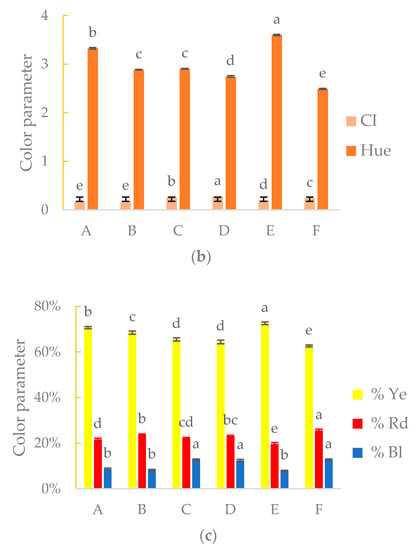 Absorbance at 420, 520 and 620 nm; (a), color intensity (CI) and color hue values; (b) proportion of yellow (% Ye), red (% Rd) and blue (% Bl) for Sauvignon Blanc wines; (c) columns marked with different letters (a, b, c, d, e, f) differ significantly (p ≤ 0.05) among treatments.