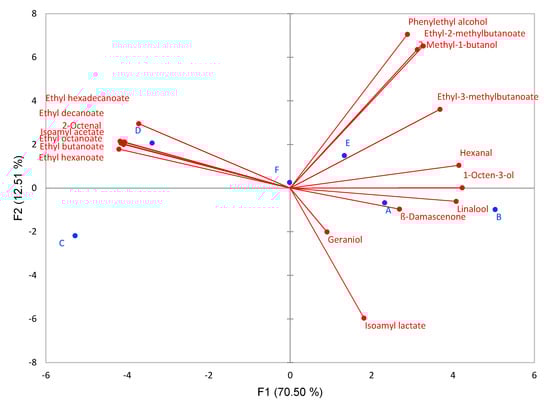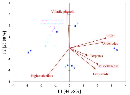 In order to evaluate the effect of applied reducing agents on the groups of the aromatic compounds in Sauvignon Blanc wines, a PCA analysis was conducted as well. The results of PCA are shown in Figure 3, where the first two components explained 70.54% of the total variance. A clear separation of the analyzed samples in a two-dimensional coordinate system was evident. Wines treated with 5% H2SO3 (A and B) and potassium metabisulfite/ellagitannins (F) were clearly separated by PC1 from wines treated with reductive agents that include ascorbic acid (Figure 3). Pre-fermentation treatment with H2SO3 and potassium metabisulfite/ellagitannins was characterized with total higher alcohols and volatile phenols. Wines produced with reductive agents that include ascorbic acid were discriminated by the majority of aromatic compound groups analyzed. It was supposed that sample D, located at the rightmost of PC1, was positively correlated with total esters, aldehydes and terpenes.