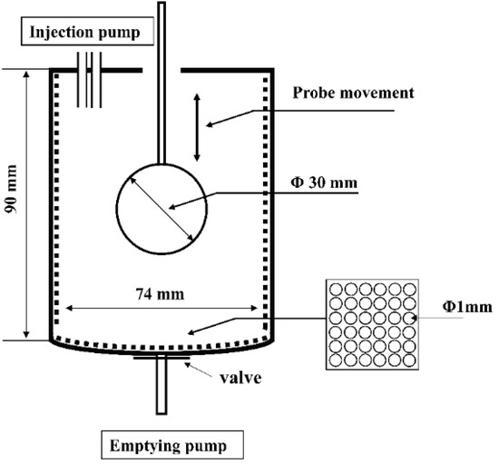 The dynamic gastric digestion model used for in vitro gastric digestion was developed according to the human gastric simulator (HGS), with some modification [16]. Simulated gastric fluid (SGF) stock electrolyte solution was adjusted to the recommended levels, as described in the standardized consensus [17]. The dynamic gastric digestion model (Figure 1) mainly consisted of a digestion beaker, a temperature-controlled incubator (HZS-HA, HDL Apparatus Institute, Changzhou, China), a spherical Teflon probe of a 30 mm diameter attached to the stepper motor via a thin Teflon rod of a 5 mm diameter, two injection pumps (F01A STP, Kamoer pump Co., Ltd., Shanghai, China), and an emptying pump (NKCP, Kamoer pump Co., Ltd., Shanghai, China). The main digestion beaker had a diameter of 74 mm, a depth of 90 mm, and a volume of 350 mL. A simple mechanical movement was able to simulate the peristaltic contractions of the stomach wall according to a published study, with modification [18]. The probe could be moved up and down under the control of the stepper motor at 9 mm/s to simulate the actual stomach contraction frequency of 3 cycles per minute [19]. The maximum antral force in this model was calculated using the mathematical modeling software COMSOL Multiphysics (COMSOL, Inc., Version 5.5, Stockholm, Sweden) and the maximum antral force was 23,000 N/m2, which was in a reasonable range of that presented in a human stomach ranging from 5134 to 67,292 N/m2 [16]. A thin polyester mesh bag (pore size 1 mm) was placed inside the digestion beaker to simulate a sieving effect of the pylorus, which only allowed particles with a size < 1 mm to pass through to the duodenum [20]. The temperature of the beaker was maintained at 37 °C using the temperature-controlled incubator.