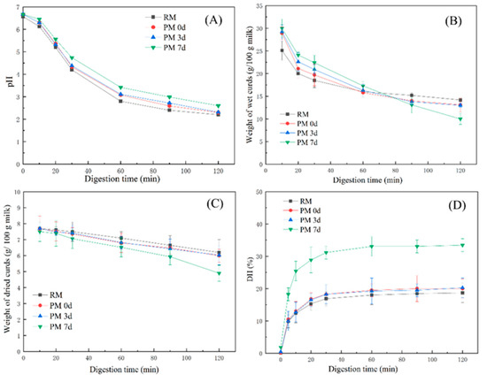 Changes in the pH (A), weight of wet curds (g/100 g milk) (B), weight of dried curds (g/100 g milk) (C), and degree of protein hydrolysis (D) from raw milk (RM), pasteurized milk (PM0d), pasteurized milk upon 3 days of storage (PM3d), and pasteurized milk upon 7 days of storage (PM7d) during in vitro gastric digestion. Error bars represent the standard deviation of three independent samples and each was measured in triplicate.